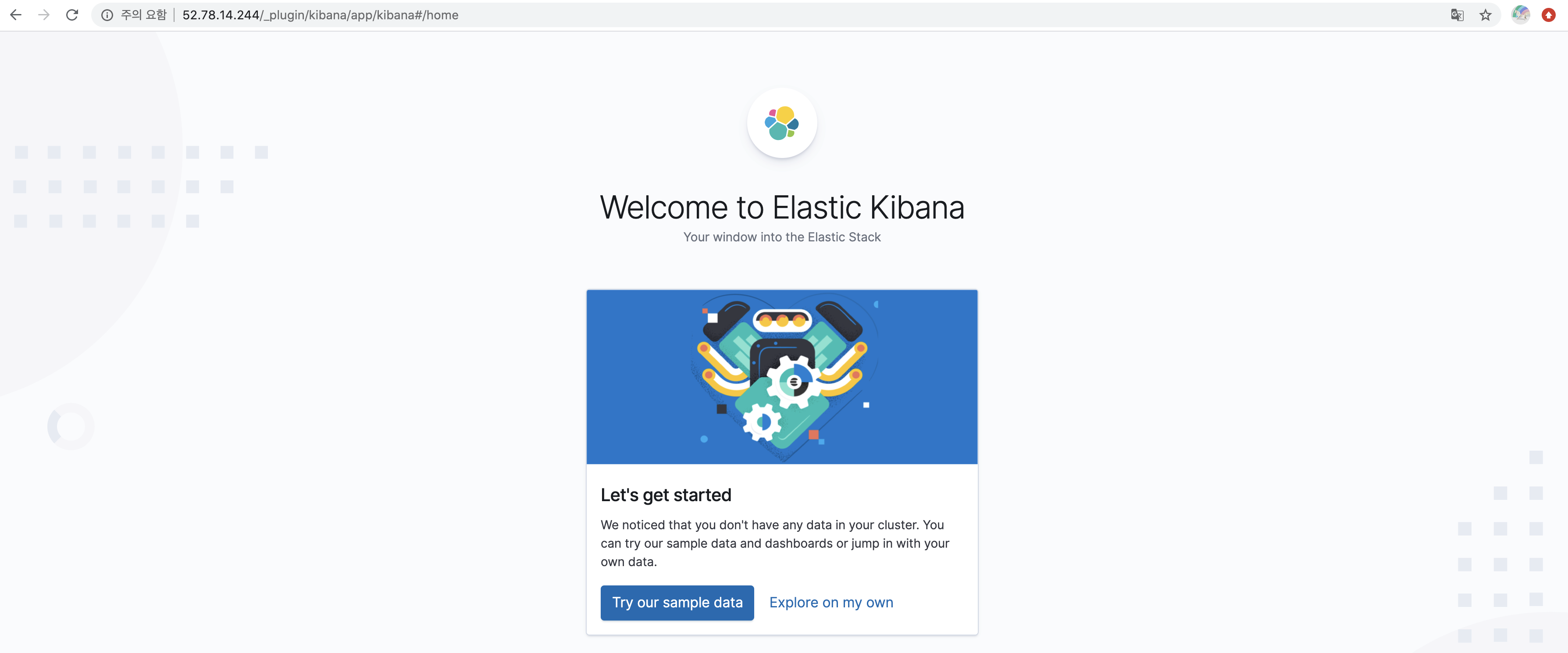 Try our sample data로 kibana 시각화 연습을 진행하여도 되고, Amazon ES로 로그 데이터 등의 데이터 전송 셋팅을 끝낸 후에 kibana에서 create index pattern을 설정하여 시각화를 진행해 볼 수도 있습니다.