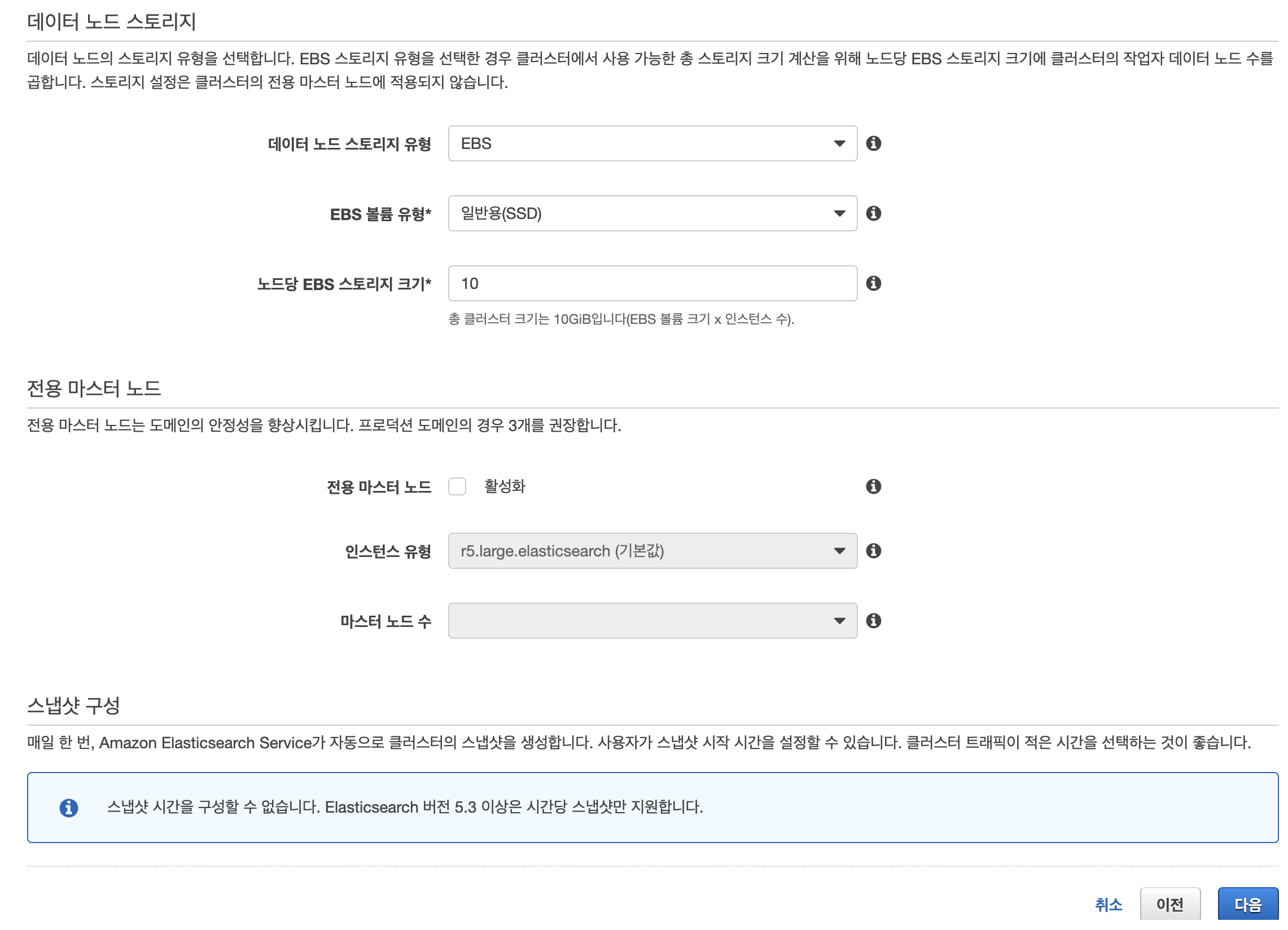도메인 이름을 작성해주고 테스트 용으로 구성을 하기 때문에 인스턴스 유형은 프리 티어를 사용할 수 있는 t2.small.elasticsearch 인스턴스를 이용하여 구성토록 하겠습니다. 데이터 노드, 데이터 노드 스토리지, 전용 마스터 노드는 디폴트 값을 그대로 두고 넘어가도록 하겠습니다.