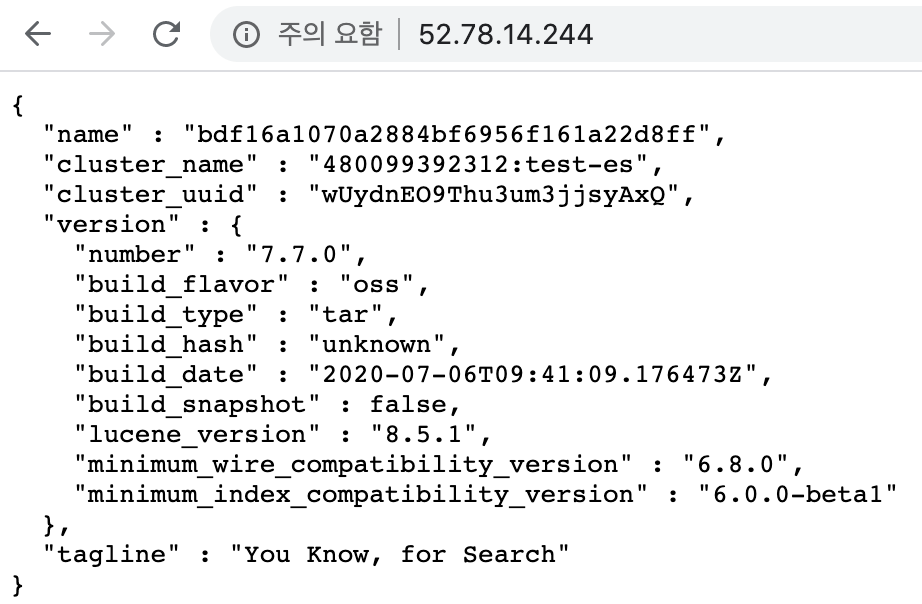 위와 같은 화면이 나오면 Amazon ES가 잘 설치되어 있는것이며, 위와 같이 접근하면 Amazon ES의 정보를 볼 수 있습니다.