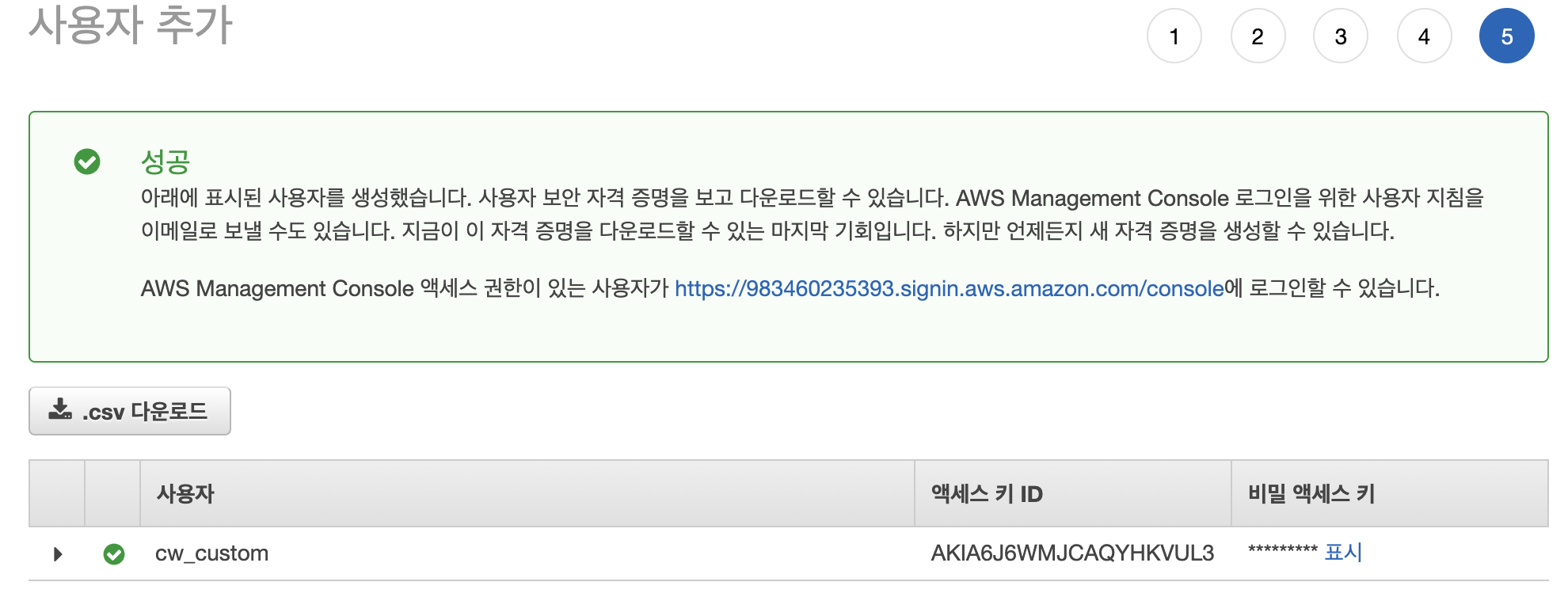 다음 눌러 IAM User를 생성하면 아래와 같은 화면이 나옵니다.