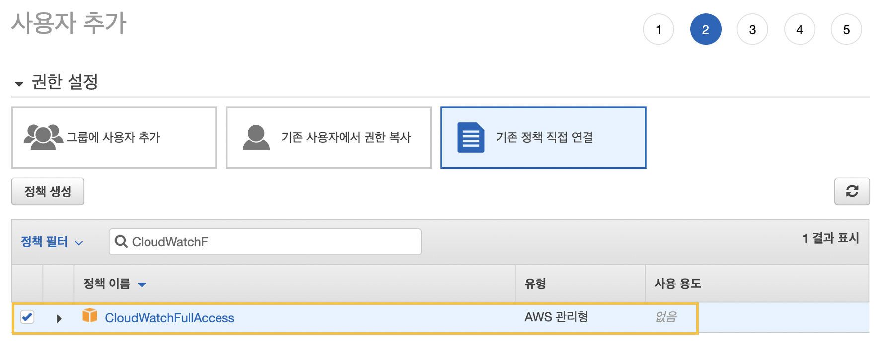 IAM의 권한은 CloudWatch Custom을 테스트 할 것이기 때문에 CloudWatchFullAccess 권한을 주어 진행하겠습니다.