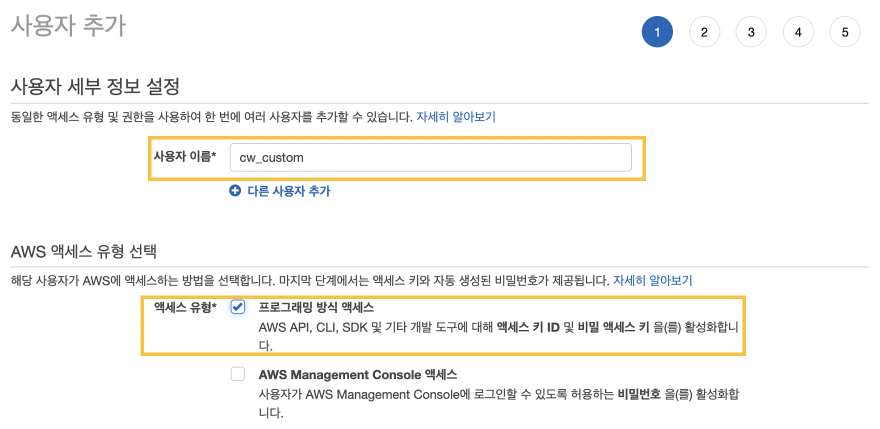 IAM > 사용자 > 사용자 추가 버튼을 클릭하여 아래와 같이 사용자 이름을 작성하고 프래그래밍 방식 엑세스만 체크 합니다.