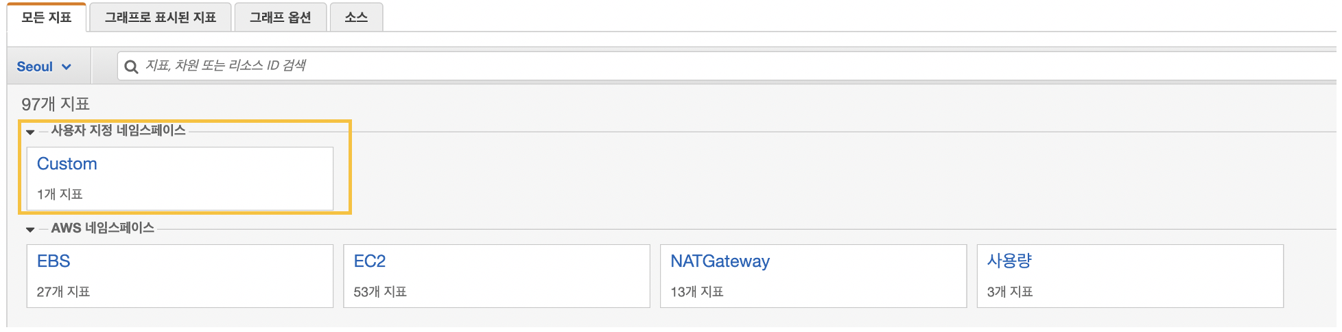 AWS 콘솔로 접속하여 CloudWatch > 지표를 선택하면 아래와 같이 위에서 설정했던 [--namespace "Custom"] 해당 설정값으로 인해 지표에 Custom 이라는 사용자 지정 네임스페이스가 보일 겁니다.