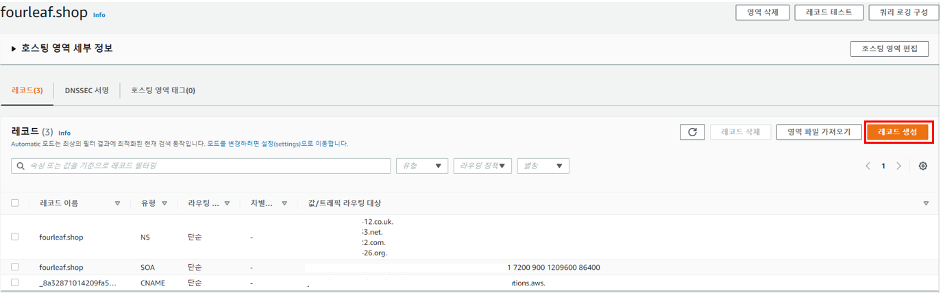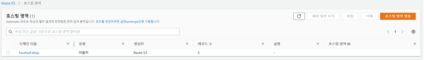 Route 53 > 호스팅 순으로 접근을 하면 아래와 같이 이전에 설정해 둔 호스팅 영역이 표시되어 있습니다.