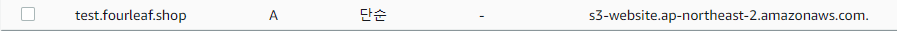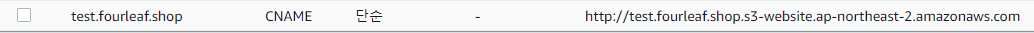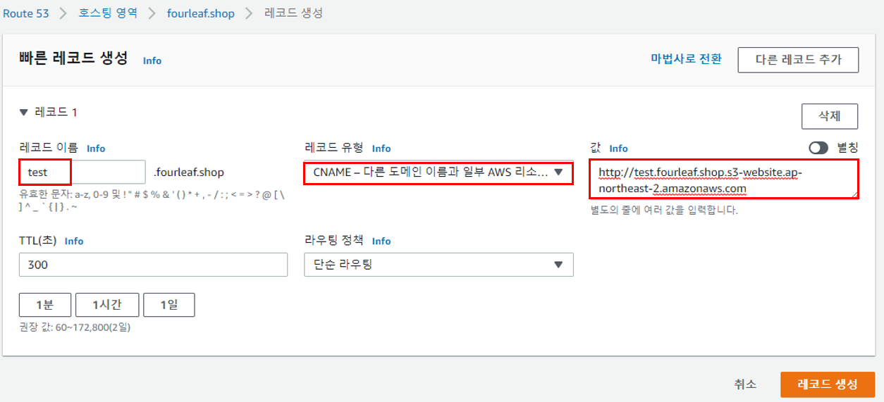 이전에 S3 정적 웹 호스팅을 하기 위해서 만든 정보를 활용하여 "유형: CNAME - 다른 도메인 이름과 일부 AWS 리소스로 트래픽 라우팅" 로 선택하여 아래와 같이 레코드를 생성합니다.