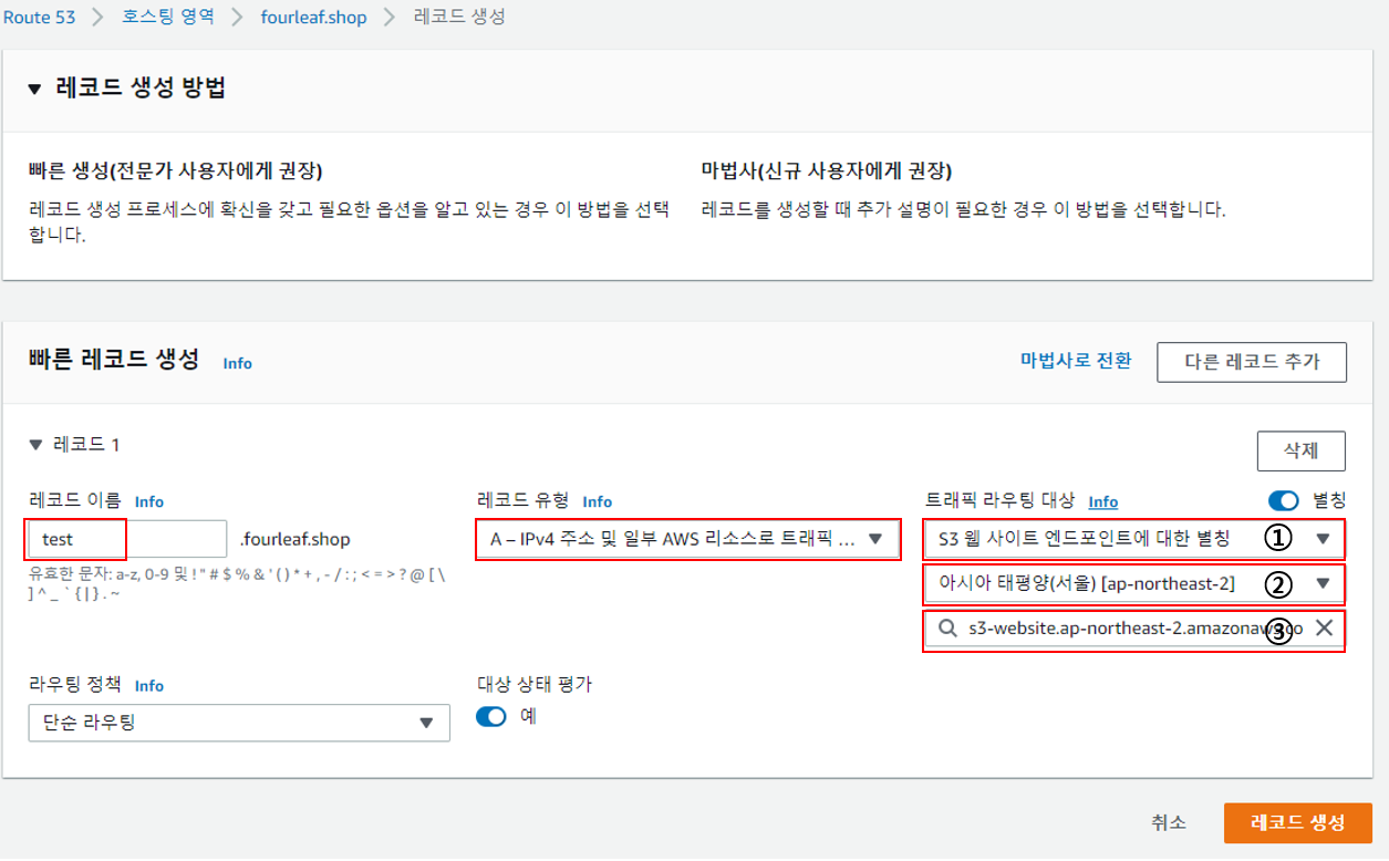 이전에 S3 정적 웹 호스팅을 하기 위해서 만든 정보를 활용하여 "유형: A - IPv4 주소 및 일부 AWS 리소스로 트래픽 라우팅" 로 선택하여 아래와 같이 레코드를 생성합니다.