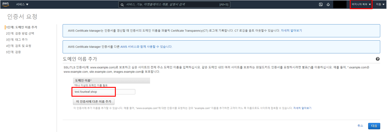 CloudFront를 이용하여 HTTPS를 제공할 때 주의하여야 할 점은 발행하는 곳이 반드시!! 버지니아 북부(us-east-1) 이어야 한다는 것입니다.