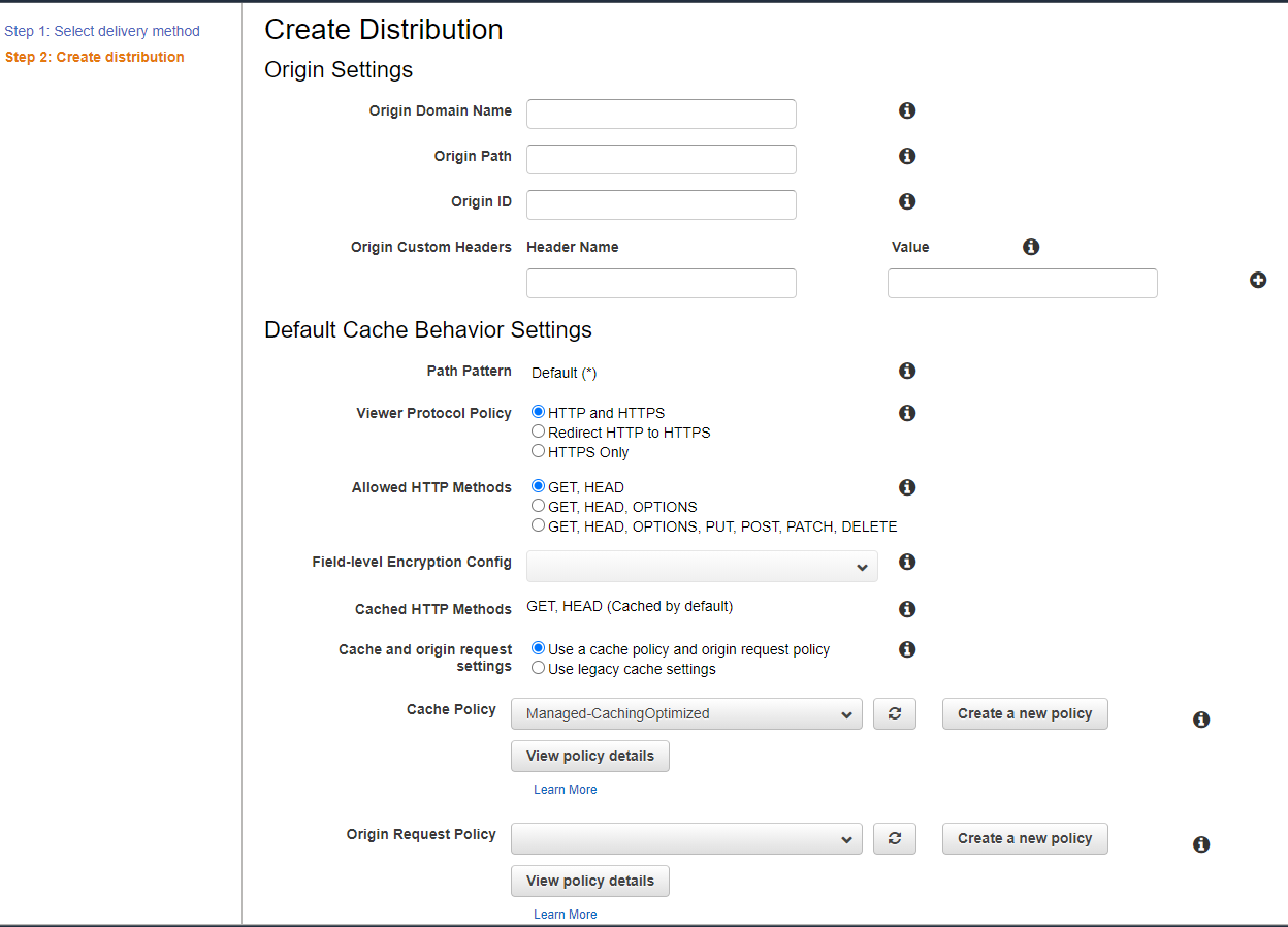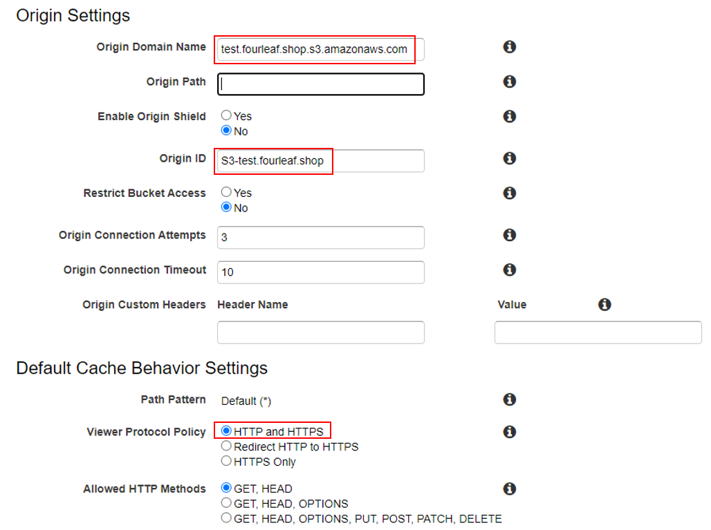 Origin Settings, Default Cache Behavior Settings, Distribution Settings 설정을 하도록 하겠습니다.