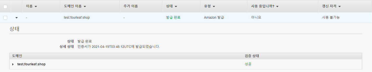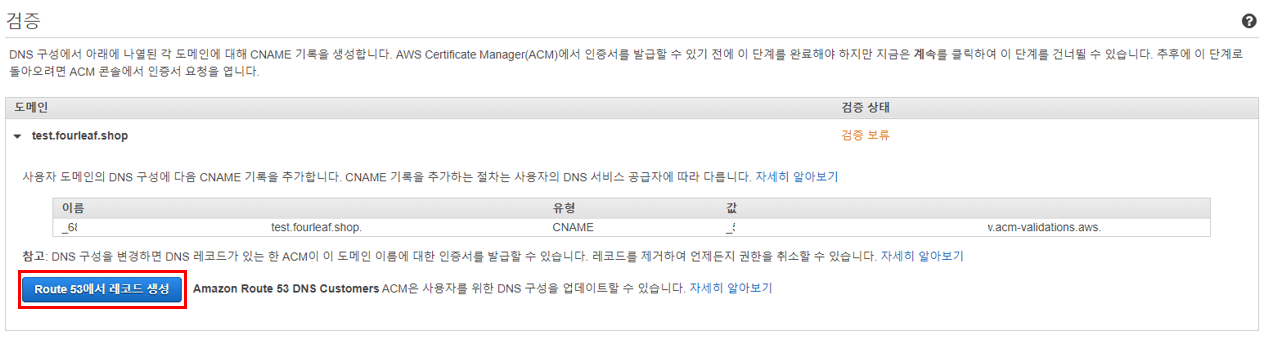 현재 검증 보류 상태이기 때문에 검증을 진행해야 상태값이 변하게 됩니다. 아래 삼각형을 클릭하면 Route 53에서 레코드 생성 버튼을 클릭합니다. Route 53을 사용할 경우 위와 같이 버튼 하나로 등록이 가능하지만 다른 외부의 DNS 서비스를 사용할 경우 그 외부에서 DNS 구성을 설정해준 후 AWS에서 상태 검사 요청을 주기적으로 날립니다. 그 상태 검사가 통과되면 사용이 가능합니다.