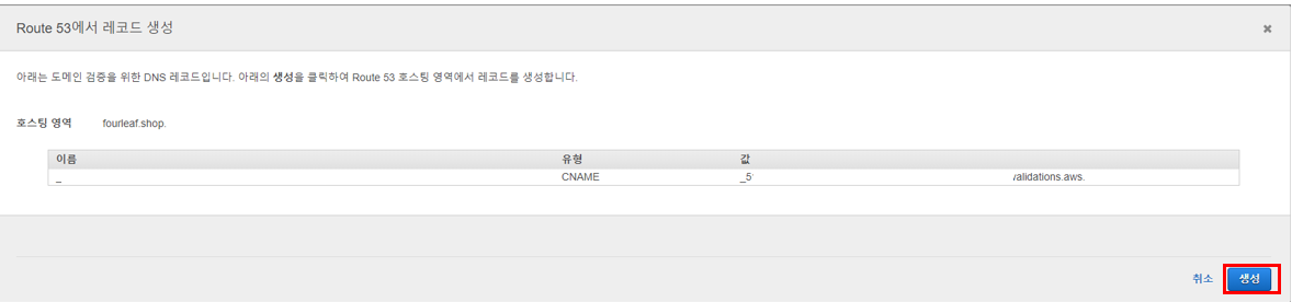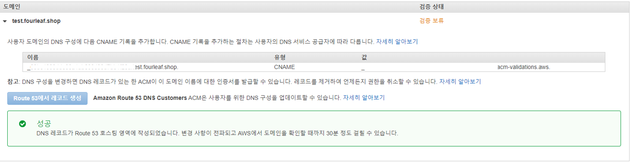 생성을 클릭하면 아래와 같은 메시지가 뜨고 인증 및 전파까지 소요되는 시간이 조금 걸립니다. 최대 30분가량이 걸리기 때문에 다음 단계를 진행하거나 대기 후 진행하시면 됩니다.