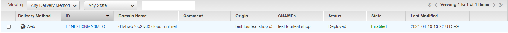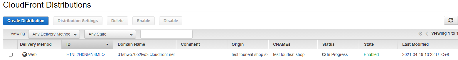 설정을 끝마친 후 Create Distribution 해주면 아래와 같은 설정된 화면이 나옵니다.