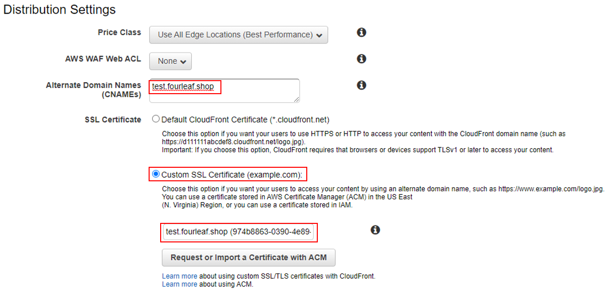 Distribution Settings에서 Altemate Domain Names에 도메인 주소를 적은 후, Custom SSL Certificate를 선택하여 아래 위에서 발급 받았던 SSL 인증서를 선택합니다.