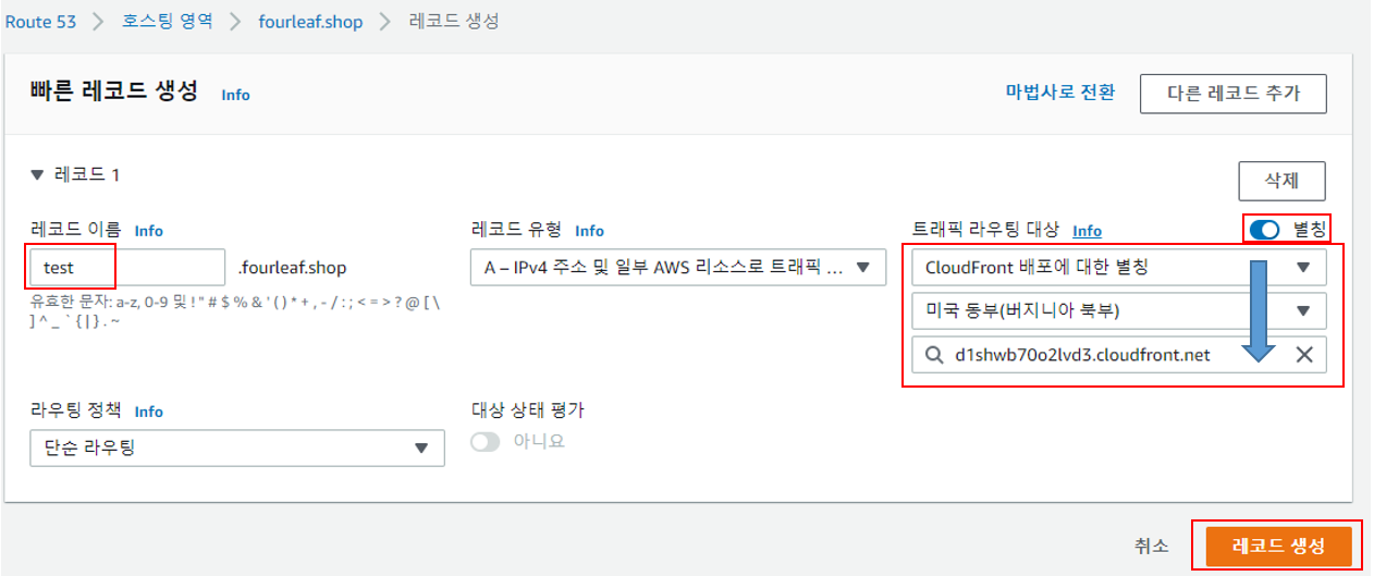 레코드 이름, 별칭(ON), 트래픽 라우팅 대상을 화살표 순서대로 선택 후 레코드 생성 버튼을 클릭합니다.
