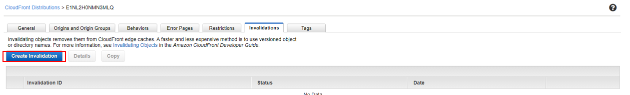 CloudFront Distribution > ID 클릭하면 아래와 같은 설정 탭들이 나타나며, Invaildations 탭으로 이동합니다.