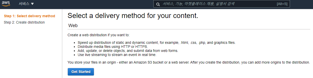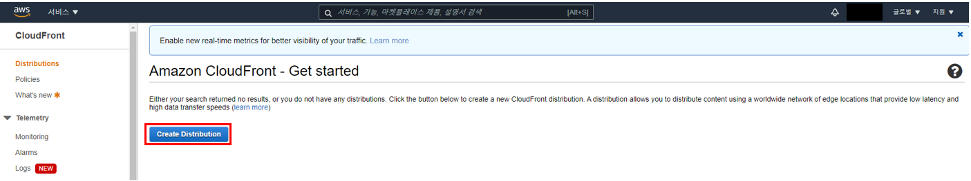 CloudFront에 접속하여 Create Distribution을 클릭합니다.