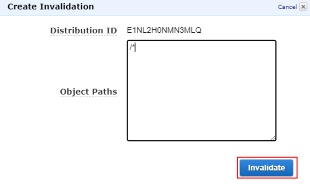 Create Invaildation을 클릭하면 아래와 같은 창이 뜨고, "/*" 을 입력하여 Invaildate 버튼을 클릭합니다.