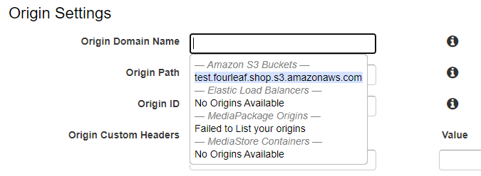 Origin Domain Name 빈칸을 클릭하면 아래와 같이 선택을 할 수 있는 항목이 나옵니다.