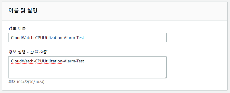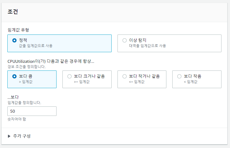 테스트를 위해 만든 인스턴스의 CPUUtilization 지표로 아래와 같이 설정하도록 하겠습니다.