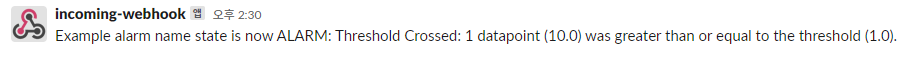 조금 시간이 지나면 아래와 같이 Slack에 메시지가 발생한 것을 확인 할 수 있습니다.