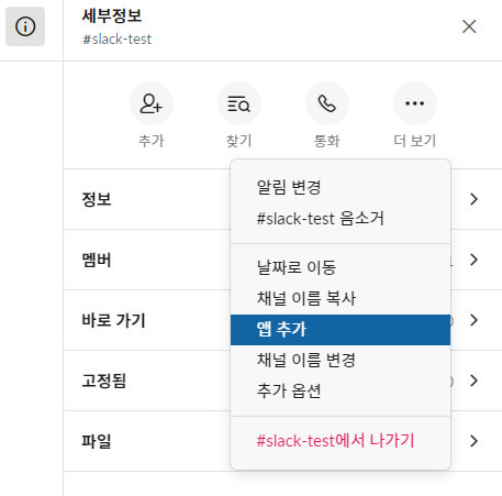 Slack에 Webhooks URL을 생성하기 위해서 Slack 채널에서 오른쪽 상단에 i 인포메이션 버튼을 클릭 > 더 보기 > 앱 추가를 선택합니다.
