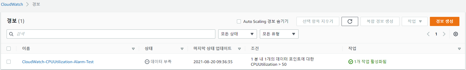 CloudWatch로부터 알람을 받기 위해서 CloudWatch 알람을 만들어 보겠습니다.