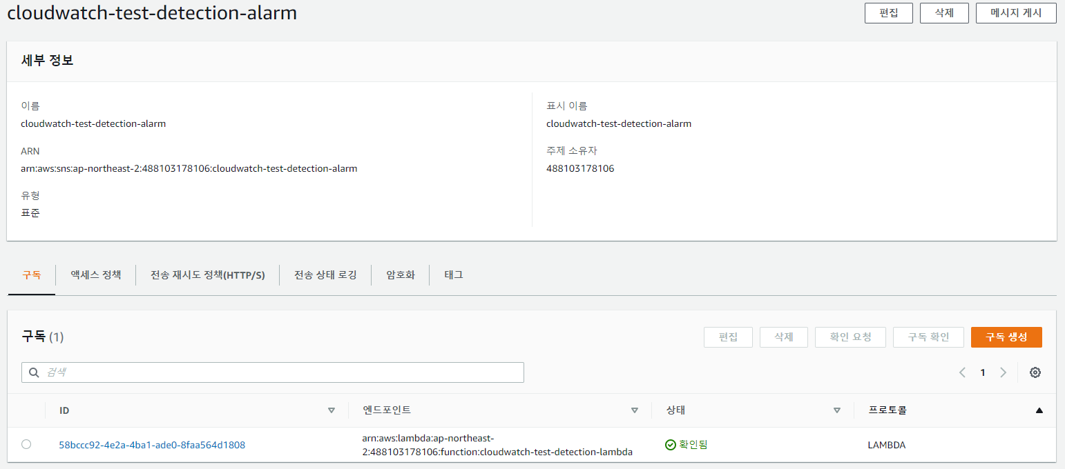 SNS 주제 페이지에 가면 아무것도 없던 구독에 Lambda 함수가 자동으로 추가 된 것을 확인할 수 있습니다.