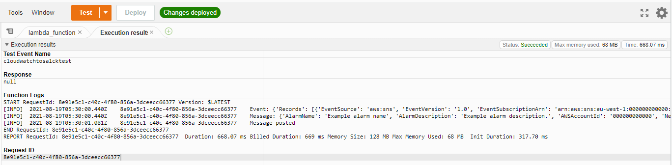 테스트 코드는 CloudWatch에서 보내는 Alarm과 동일한 형태의 테스트 이벤트 메시지입니다.