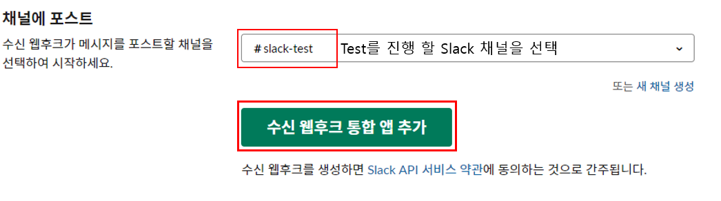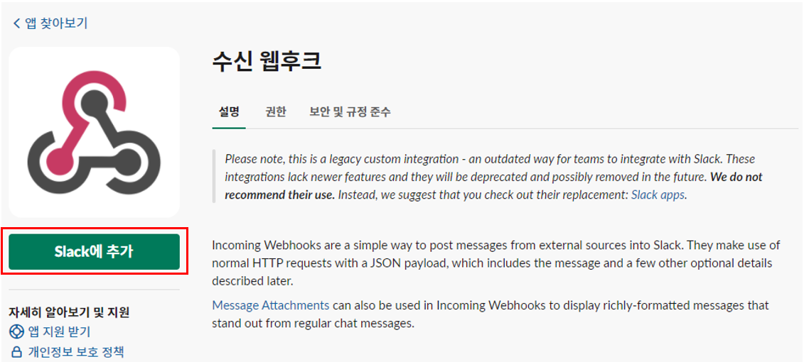 Slack 채널을 선택 후 수신 웹후크 통합 앱 추가 버튼을 클릭합니다.