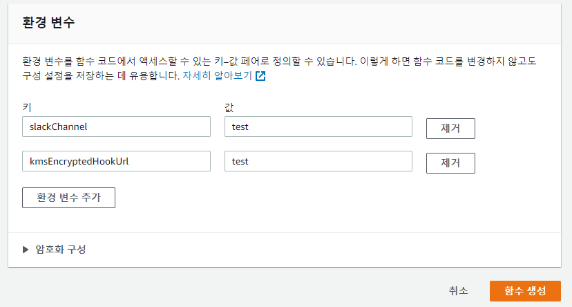 함수 생성에 사용되는 환경 변수 값들을 넣어 주어야 합니다. 코드를 좀 더 편하게 수정하기 위해서 임시로 임의의 값을 넣어서 함수를 먼저 생성하도록 하겠습니다.