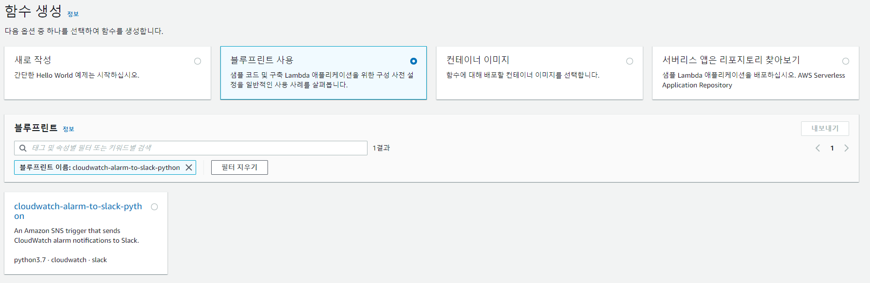 Lambda Code를 신규로 작성할 필요 없이 블루 프린터 > slack을 검색하여 cloudwatch-alarm-to-slack-python을 선택합니다.