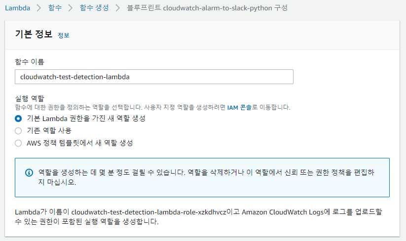 구성을 클릭 후 함수 이름을 작성, 실행 역할을 기본 Lambda 권한을 가진 새 역할 생성을 클릭합니다.