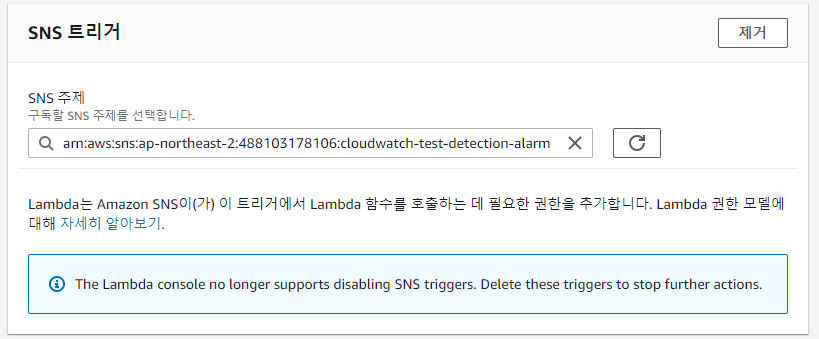 SNS 주제 페이지에 가면 아무것도 없던 구독에 Lambda 함수가 자동으로 추가 된 것을 확인할 수 있습니다.