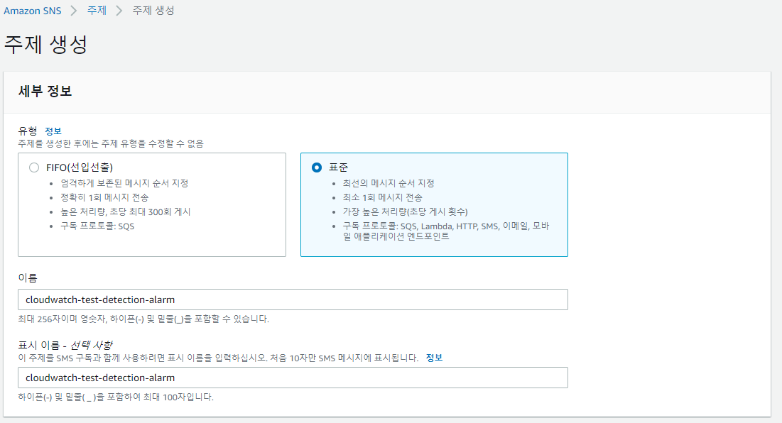 CloudWatch가 알림을 넘길 SNS topic을 만들어 줍니다. Amazon SNS>주제>주제 생성을 선택하여 만들어 줍니다.