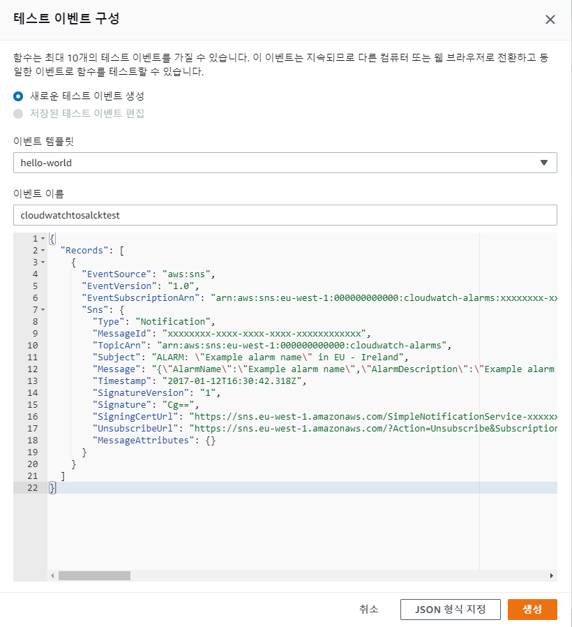 전문은 https://github.com/blueimp/aws-lambda/blob/master/cloudwatch-alarm-to-slack/test-event.json 이곳에서 확인 가능합니다.