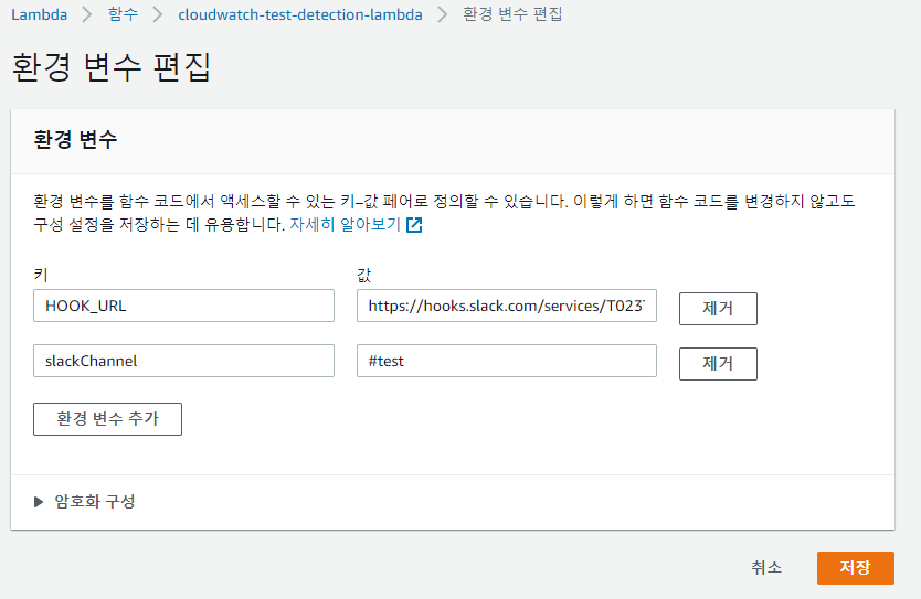 위에서 임시의 값으러 넣어준 환경 변수를 편집하도록 하겠습니다. HOOK_URL의 값에 위에서 복사하여 보관 한 웹 후크 URL을 넣어주도록 합니다. slackChannel은 위의 변경 코드에서는 사용하지 않지만 추후 사용하기 때문에 넣어서 진행하도록 하겠습니다.