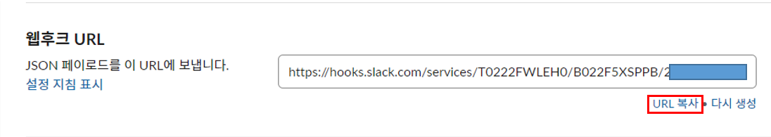 버튼 클릭 후 넘어간 페이지에서 스크롤 중간쯤 웹 후크 URL을 복사 할 수 있는 부분이 있습니다. URL을 복사하여 따로 보관하거나, 해당 페이지를 닫지 않고 다음 작업으로 진행합니다.(해당 값은 추후 Lambda Funtion에 사용 예정)
