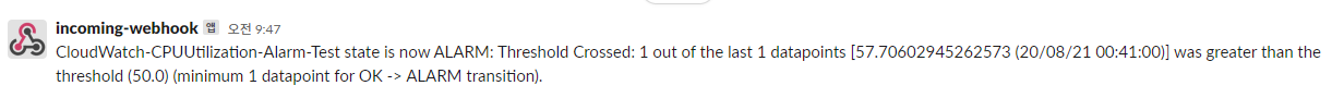 조금 시간이 지나면 아래와 같이 Slack에 메시지가 발생한 것을 확인 할 수 있습니다.