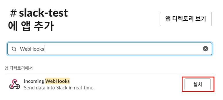 검색창에 WebHooks 라고 검색후 아래와 같이 Incoming WebHooks 설치 버튼을 클릭합니다.