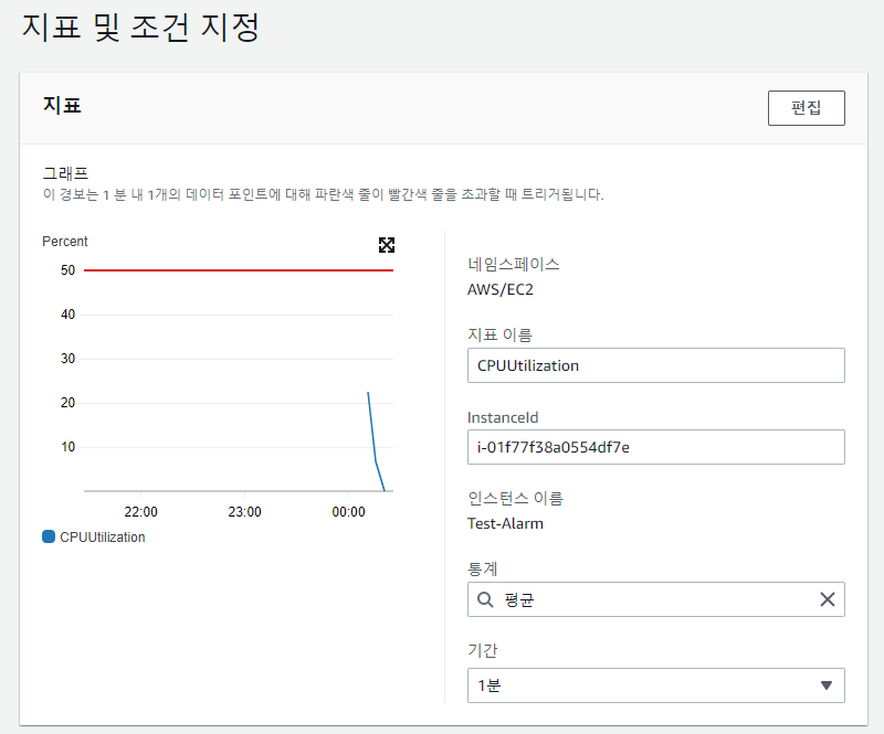 테스트를 위해 만든 인스턴스의 CPUUtilization 지표로 아래와 같이 설정하도록 하겠습니다.