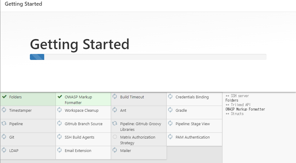 Install suggested plugins를 클릭하여 jenkins가 추천하는 plugin을 설치하도록 합니다.