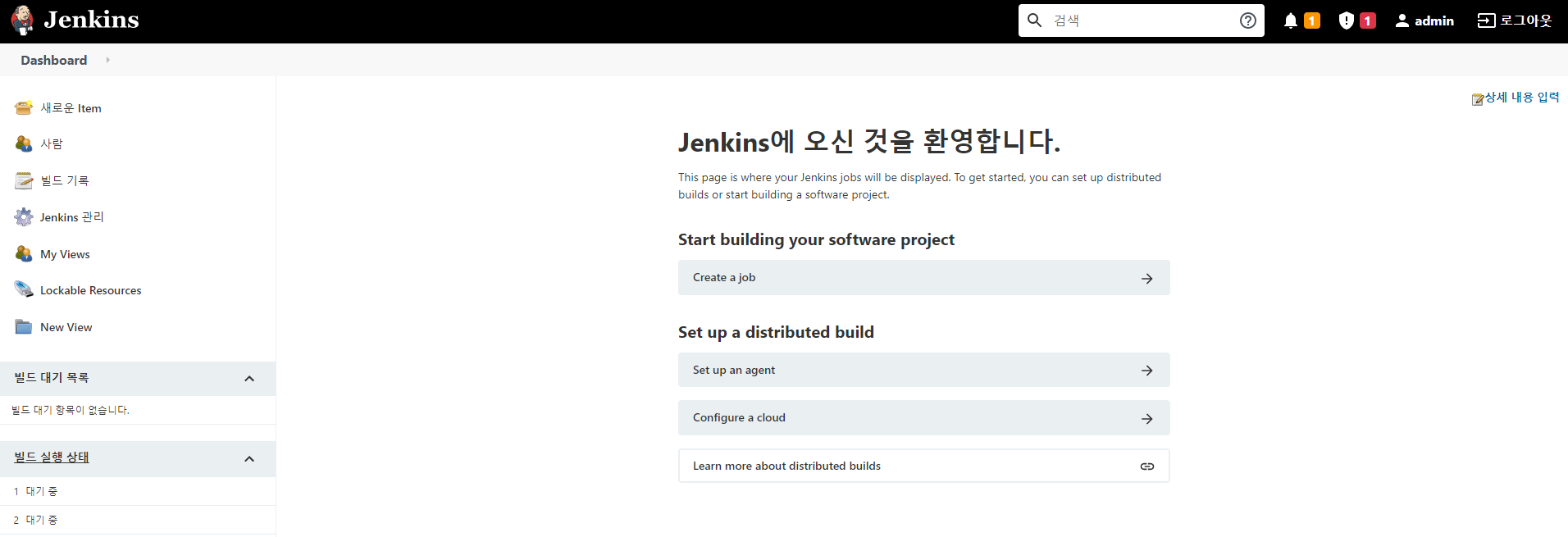 다음과 같은 화면이 나오면, Jenkins 설치 및 초기 셋팅이 마무리됩니다.