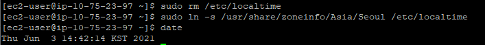 sudo ln -s /usr/share/zoneinfo/Asia/Seoul /etc/localtime