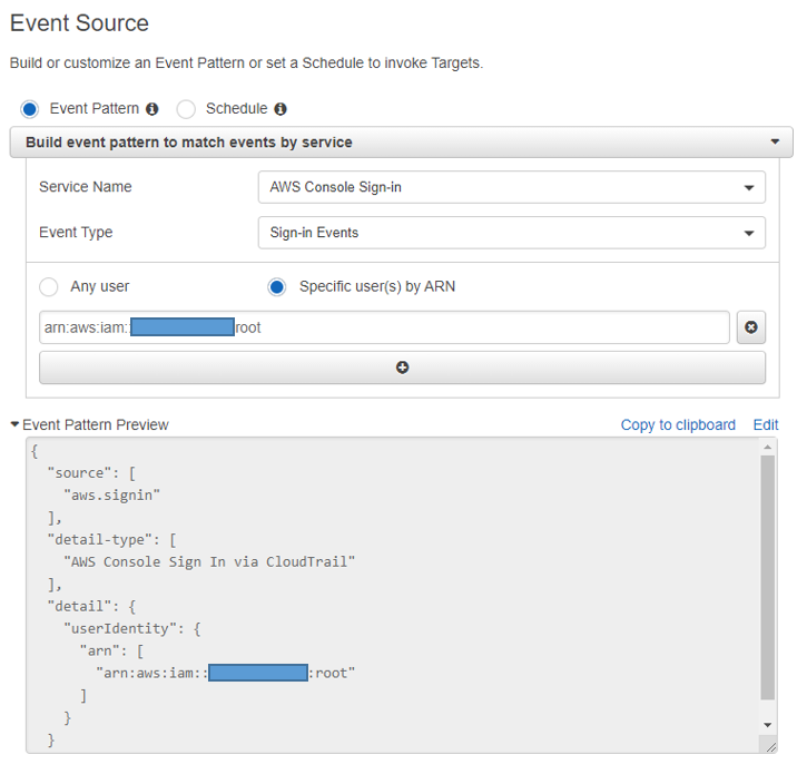 Any user 에서 Specific user(s) by ARN을 선택 후 아래 칸에 ARN을 입력하면 Event Pattern Preview에 자동적으로 반영이 됩니다. 위에서는 root만 추가하였지만 필요한 IAM의 ARN을 추가로 입력하면 입력된 대상의 AWS Console 로그인에 대해서만 Slack Message를 받을 수 있습니다.