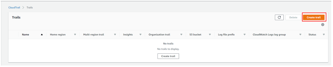 CloudTrail > Trail > Create Trail 순서로 클릭합니다.