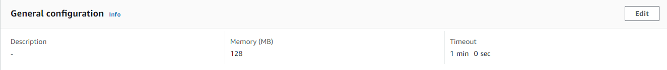 Lambda 함수 생성 후 구성 > 기본 설정 > 편집 버튼을 클릭하여 제한 시간을 1분으로 늘려줍니다.