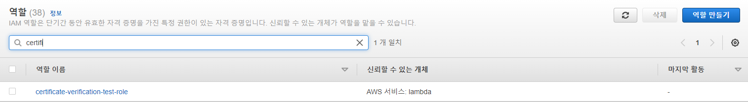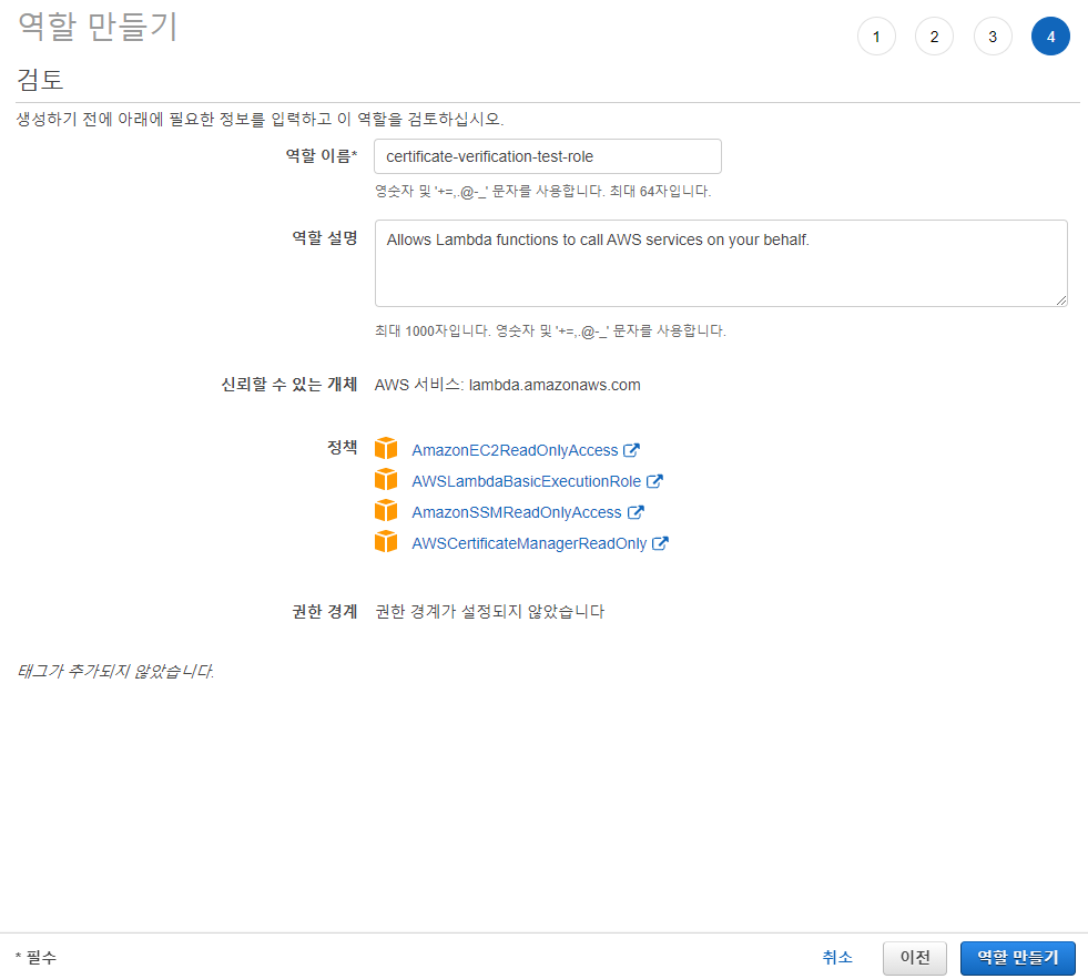 위와 같은 화면이 보이면 IAM Role(역할) 생성이 완료 되었습니다.