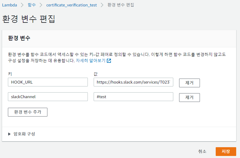 구성 > 환경 변수를 클릭하여 Slack 에 대한 환경 변수를 입력합니다.