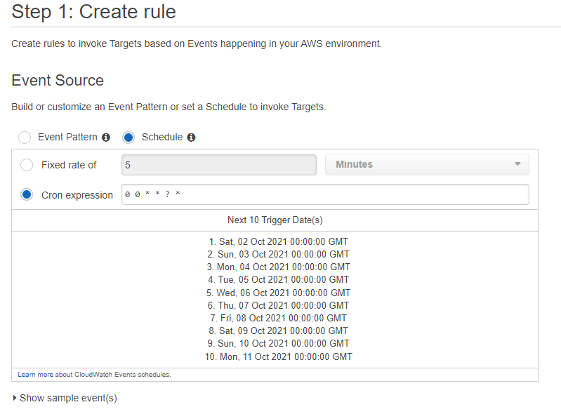 Event Source에서 Schedule로 선택 후 Cron expression에 0 0 * * ? * 을 입력합니다. 아래에 예정된 10개의 Trigger Date가 표시되게 됩니다. 간략하게 설명 드리자면 매일 00시 00분 00초(GMT 시간)에 이 Event가 발생하게 하겠다 라고 설정을 하는 것입니다. 한국 시간으로 계산을 하려면 +09:00 를 해야 하기 떄문에 한국시간으로는 매일 오전 9시에 이 이벤트 Rules가 발생하게 하는 것을 설정한 것입니다.