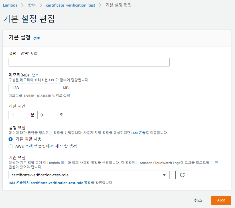 Test 전에 수정해야 할 부분이 한 곳 있습니다. 모든 Region의 인증서에 대해서 조회 후 처리하기 때문에 runtime 시간이 조금 길게 나옵니다. 그렇기 떄문에 Lambda의 Runtime의 시간을 늘려주도록 하겠습니다.