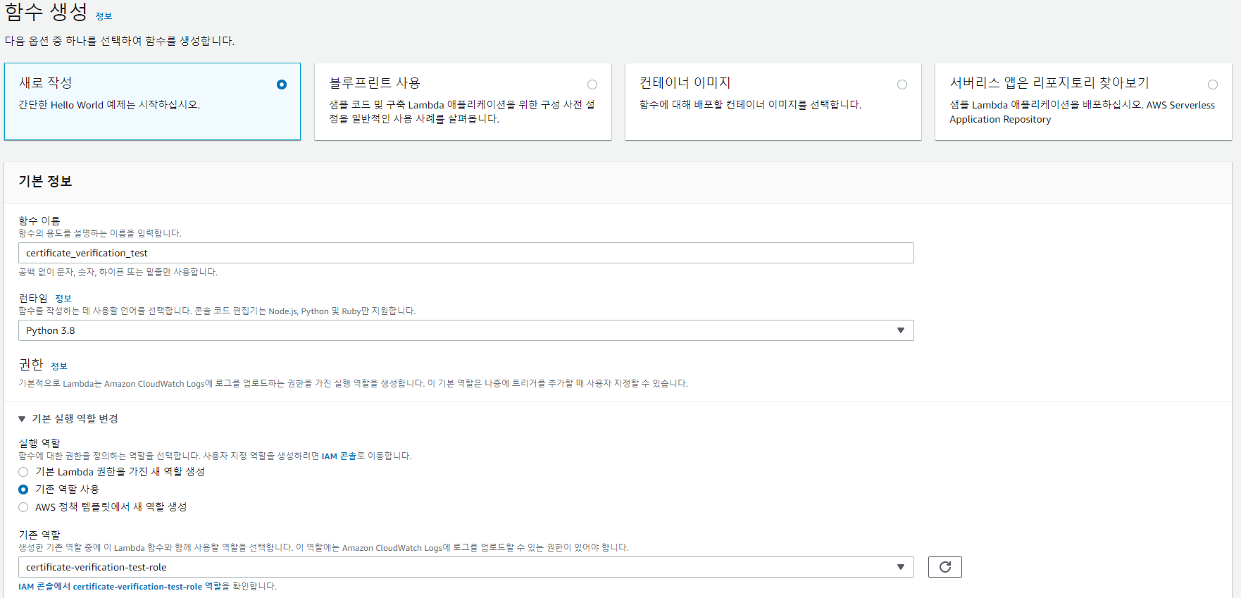 Lambda Function 생성 설정을 아래와 같이 설정 후 함수 생성을 클릭합니다.